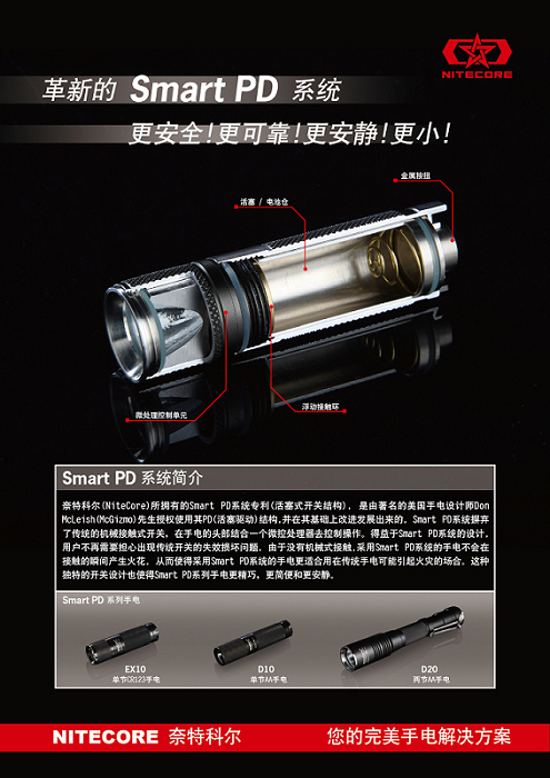 D10是NiteCore公司首个采用Smart PD设计的手电。PD是英语piston drive的缩写,也就是活塞驱动的意思。D10手电内部结构并不包含常规手电所采用的开关部件,而是采用一个全金属活塞套筒的电池仓结构达到电路导通的作用;而手电的开关和功能控制,则是通过手电头部内藏的微处理器感应金属活塞的上下运动来做出相应的功能控制。