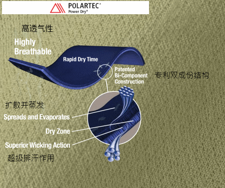 按Polartec网站的介绍,PowerDry分为两层,使用不同的织法, 内层吸湿,外层快干,从表面看内层有很多的条状的稀疏孔隙, 外层则是看上去很均匀的织物, 透光看有种很复杂的立体感,Polartec声称这样就可以保证将皮肤表面的汗珠迅速吸出送往外层扩散开而蒸发掉