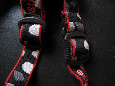 k、 松紧带比较宽厚,戴起来比较舒服,上面的调节扣如图,果然不出我所料,头大如我,两颗调节扣都快松到边缘了。