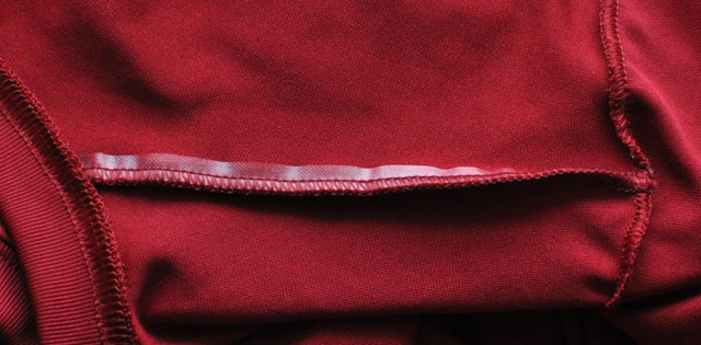 6)肩膀上的缝线还有胶条,背包的时候可以提升舒适度,这是个很值得称道的地方。但是收到的这件,缝得不够仔细,缝线2头压的方向不一致,中间扭曲了。选购衣服的时候要注意