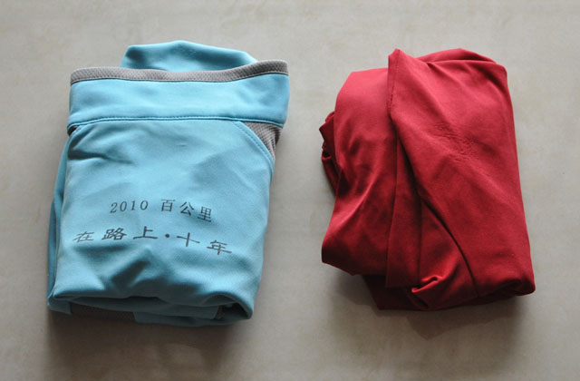 4)折叠后的大小,和去年百公里T恤对比,只有它的2/3体积。长线装包也省空间了