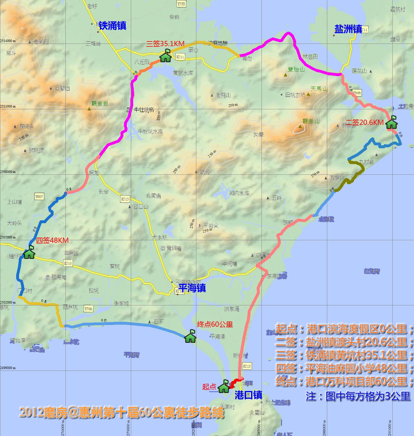 由于巽寮至稔山大埔屯路段有多个大型工程项目施工,过往工程车辆较多,不适宜大型徒步队伍通过。为保障第10届磨房惠州60公里徒步的安全和顺利进行,现对原定的60公里徒步线路做以下重大调整,敬请广大驴友周知并请各领队转告徒步队员。