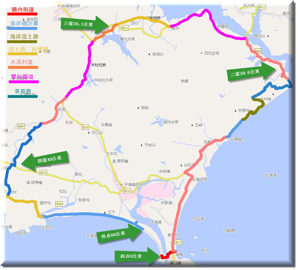 油麻园小学--溪边小路--Y706--葫芦坑村--平海三姐妹石--双月湾西海岸线--万科项目部(终点60公里)