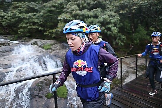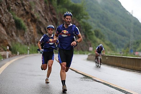 红牛户外队“传奇夫妇”乌斯海尔在跑骑交替环节中