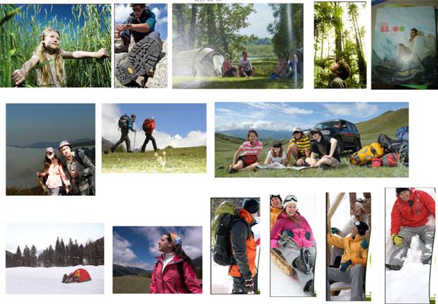 3)着装图片:户外活动中着装本品牌产品,并体现出户外旅途的快乐意境且图片色彩集中 (附参考图);