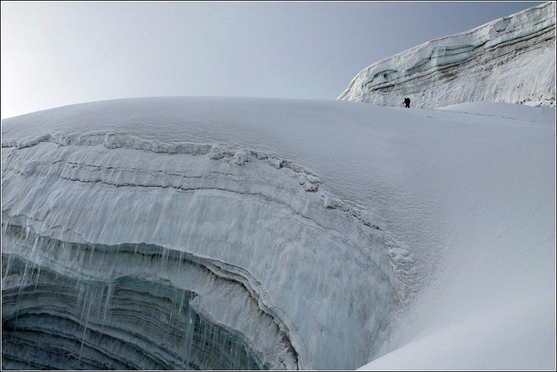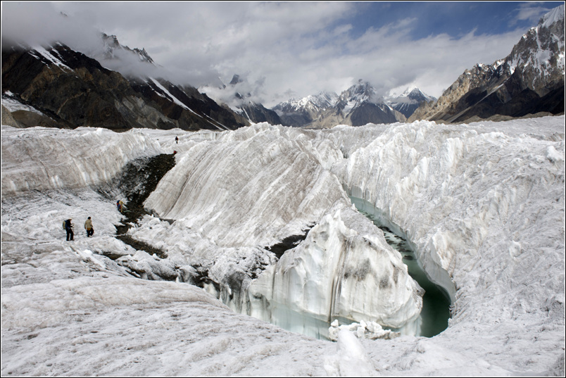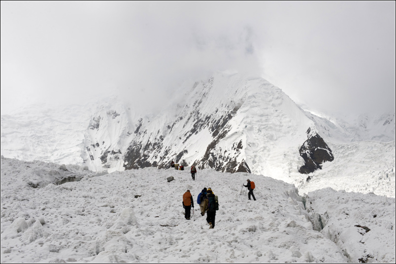 这天的天气不好,风雪交加,能见度很低。我们一直行走在Baltoro冰川中间的碎石坡上,而两边则是巨大的冰川,比去K2大本营路上看到的冰川还要壮观。非常奇妙的是Baltoro冰川在它的尽头来了一个90度的急转弯,直指Gasherbrum I&II大本营的方向。我们依然行走在两个冰川中间的碎石坡上,而左右两边则是若隐若现的雪山。在翻过一座又一座的碎石坡后,云雾慢慢散开,我们发现前面有一排更高的雪山挡住了我们的去路,我们已经无路可走。我们5个人当时的共同感受就是:这就是世界的尽头,如果这个世界有尽头的话。环顾四周,我们被数座6000米以上的雪山环抱,而巨大的冰川就在我们脚下,这里很少人知道,更少人到达,除了那些专业的登山家之外。