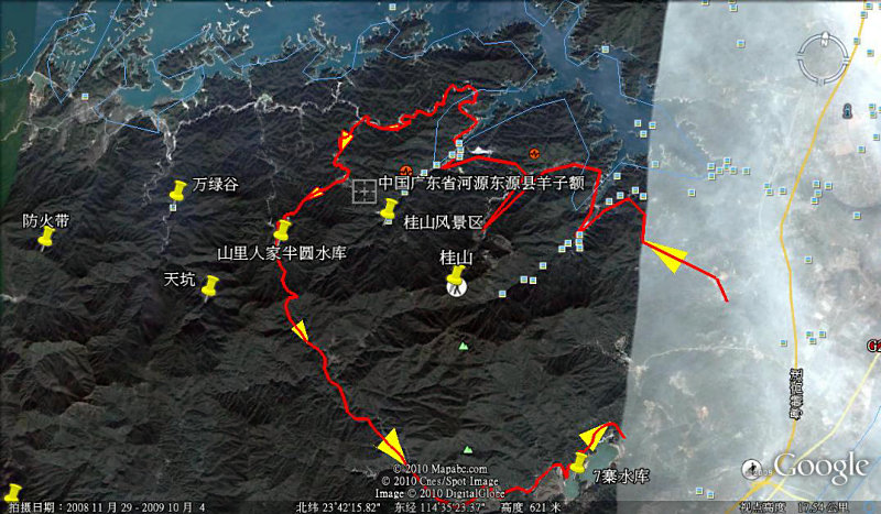 经过28号源动力三位车友在山里人家进去七寨水库出来,进去时就同保安说进去就出来到现在还没出来,我考虑我们再从山里人家进去可能是不可能的了。再对GOOG地球路线确认。临时决定路线倒过来骑,羊子额进去。