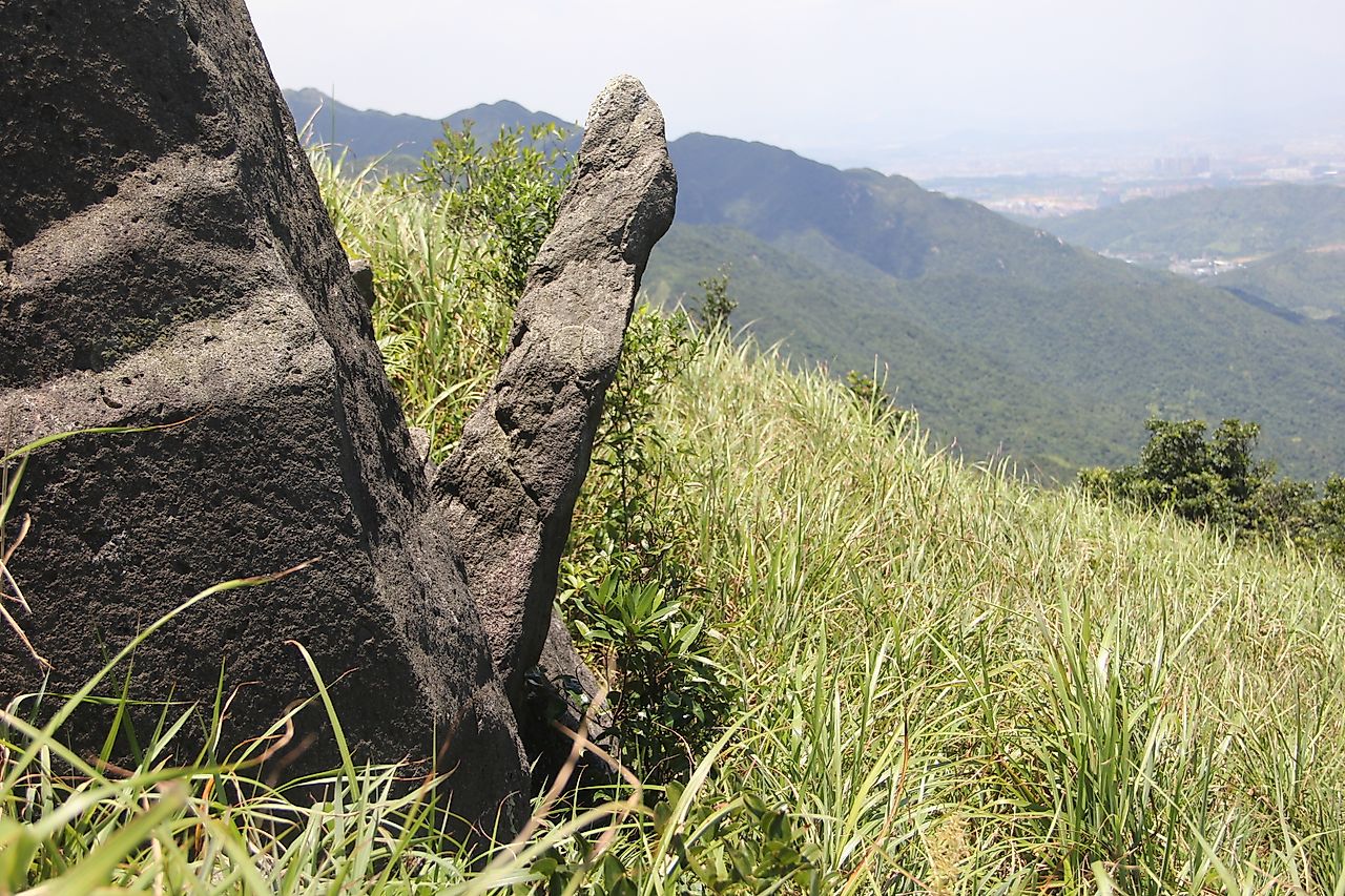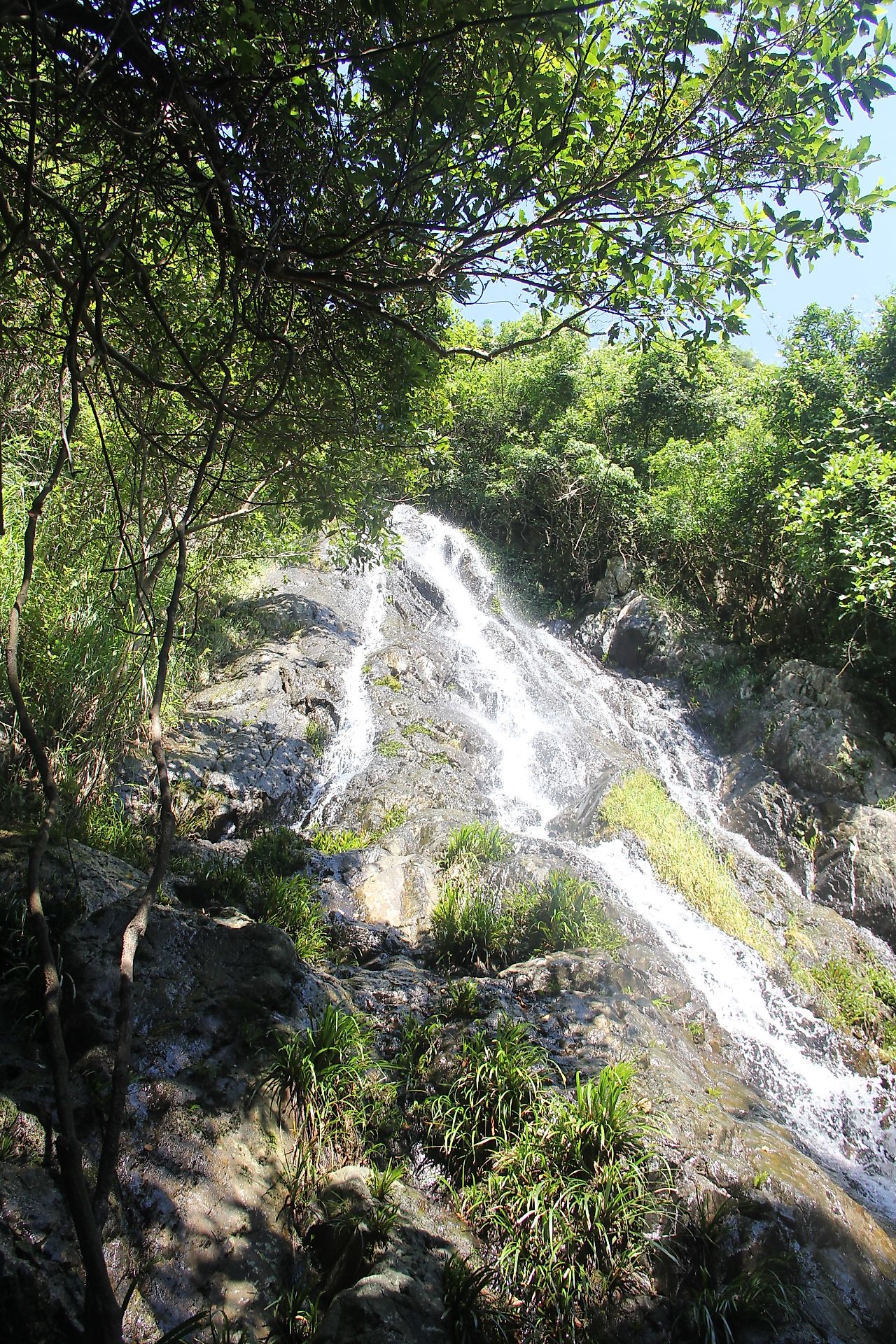 新径排右支与石头河的出口类似,都是巨大的石头,藤蔓密布,河谷陡峭,走几步就得攀岩。有一高约15m的瀑布,几乎是垂直的,从瀑布的左侧攀上,山势变成平缓。有一条人工修整的小径,河谷在这条路的下方。河谷与小径逐渐汇合,这时河流已经变成潺潺小溪。小溪有多处分叉,一路走左侧。在溪谷尽头,有一条隐没在茅草中的小路。这条路是看不到的,只能看到路的起点在茅草中似乎与其他的地方有那么一点不一样,从这条小路走出去,到一条与之交叉的比较明显的路,就是大笔架的穿越路径了。溪谷与大笔架的山脊的交叉点,是从大笔架顶峰往北的第二个鞍部。