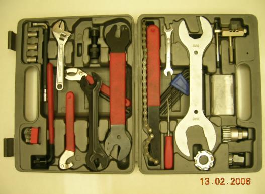 先登場的自然是工具組。年初四跟 傲天 車友到車友 朋克 的店裡買的。質量還可以。不過在台灣我不是用工具組,而是每項單項分別買的,有 Park Tools 的,也有 Shimano 的,質量更好一些。尤其是很多地方會用到 M5六角板手,絕對值得準備一支長柄、質量高一些的。