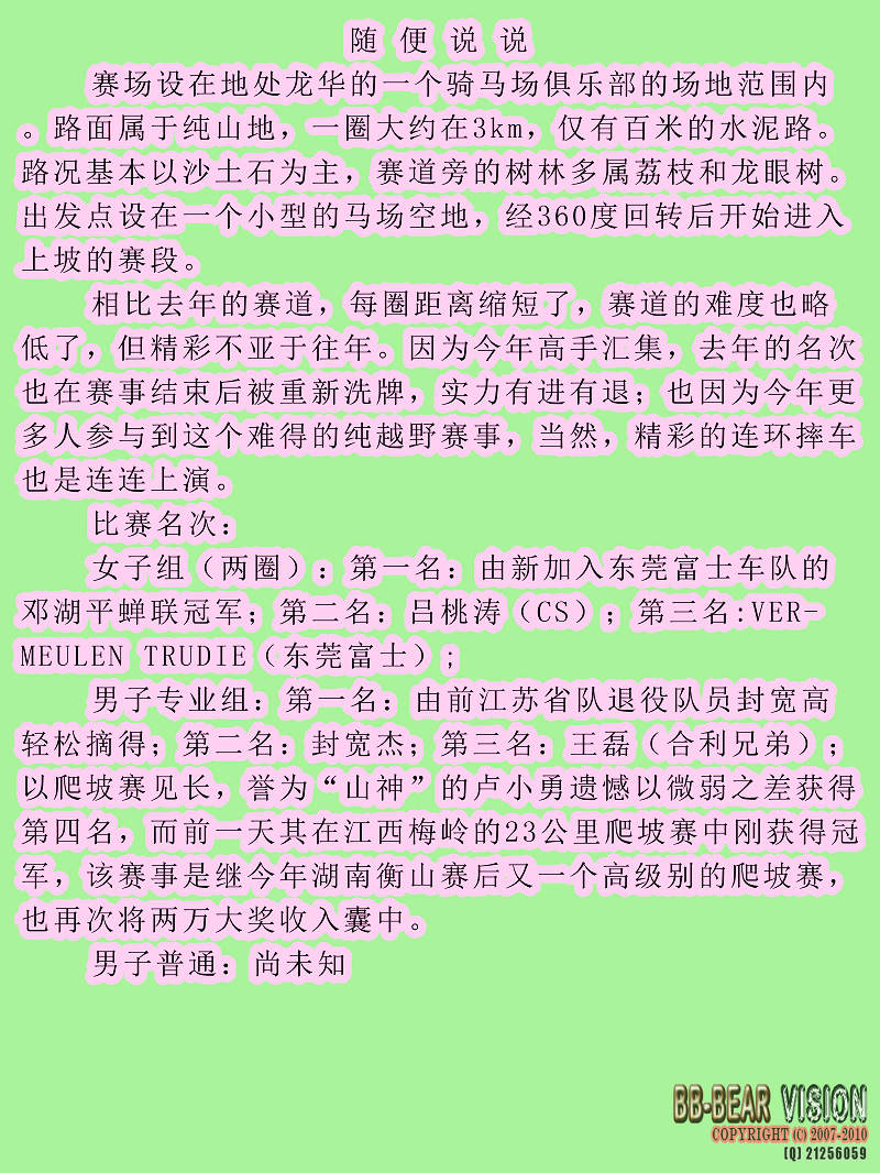 去年该项赛事给热爱山地越野的车友们带来了精彩的视觉套餐,而今年,代表全国业余最高水平的山地车手均如数到场,主办方更是邀请来了前江苏省队的封宽高,他在本届赛事中轻松斩获头名,而其妻子任成远更是在本次广州亚运会上获得女子山地车冠军。