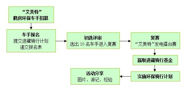 2、各地复赛前3名将获得艾美特赞助的西藏骑行基金并签订承诺书,在1年内实施西藏骑行计划,活动后进行骑行经历和环保经验分享,包括但不限于图片、游记、微博等(命题与低碳环保相关)。