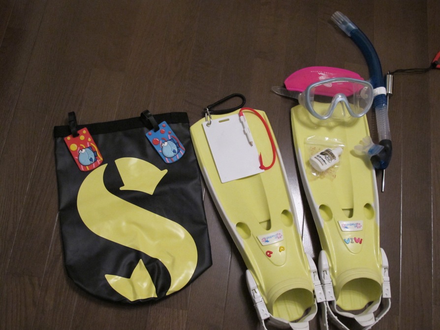 从左往右依次是:防水袋、小鱼识别牌、写字板、Fin、面镜&发带垫、防雾剂、呼吸管、叮叮~