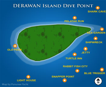达拉湾岛的潜点种类丰富,包括有峭壁潜、洞潜、以及珊瑚礁岸潜。晚上,常常有绿海龟上岛下蛋。达拉湾岛周围共有9个潜点,蕴含丰富的海洋生物种类。比如白鳍鲨、豹纹鲨和护士鲨、乌贼、马鲛鱼、jack、鲳鱼以及色彩缤纷的珊瑚鱼类,大型的海扇、各色海兔、管状海葵、丝带鳗和不同颜色的海百合。这里还发现有新品种的珊瑚Acropora Derawanensis。 达拉湾岛的码头也聚集有鲛鱿、鳄鱼鱼、龙虾、伪装蟹、海马以及各种各样的软虫、魔鬼蝎子鱼等等。在“珊瑚花园”潜点的浅水区(10米)生长有非常健康的珊瑚以及大量的扁虫、海兔、丝带鳗、大个头的blenny和小丑鱼。