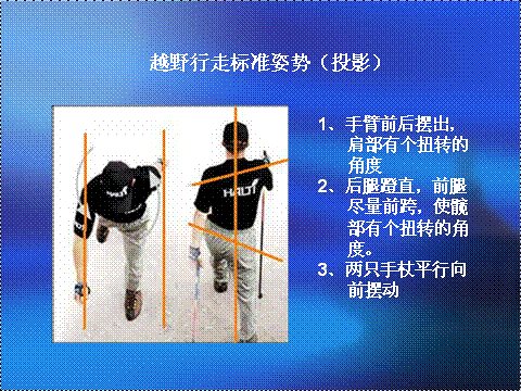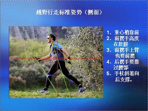较倾斜的陡坡动作和平常走路一样,但是手臂要往前将登山杖的位置放在身体的前面,利用登山杖支撑身体往上,来减轻腿部的压力,必要时可同时使用两支登山杖来做爬升的动作,推身体往上的时候,手掌可放在杖的顶部加强推的力量。