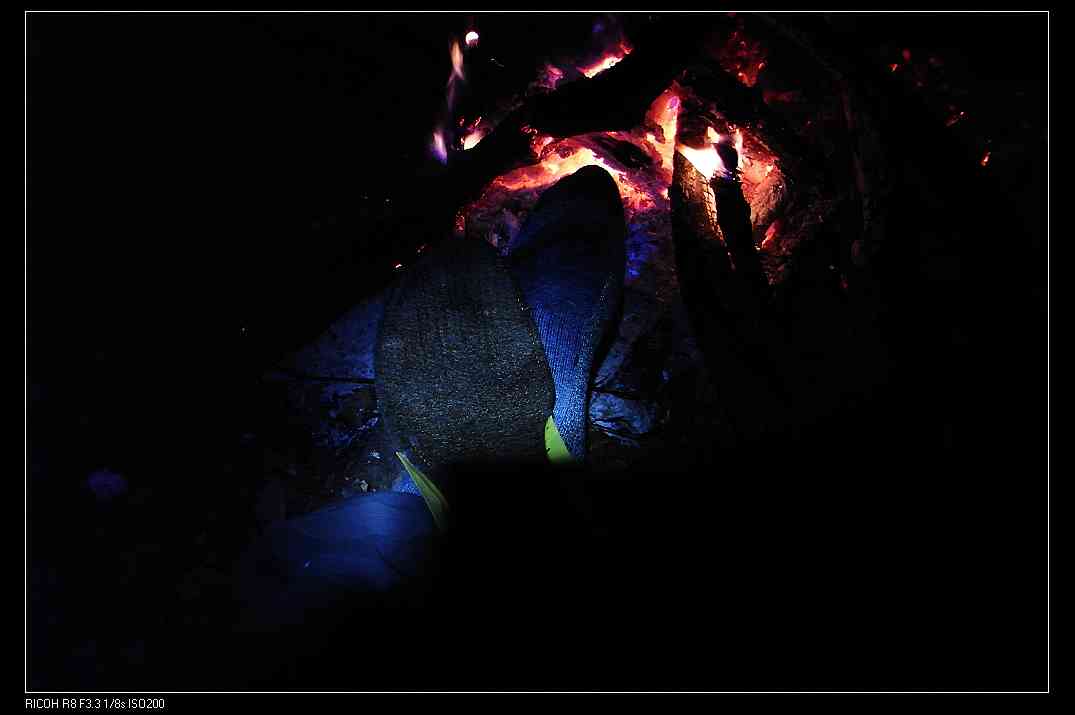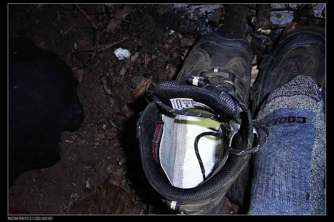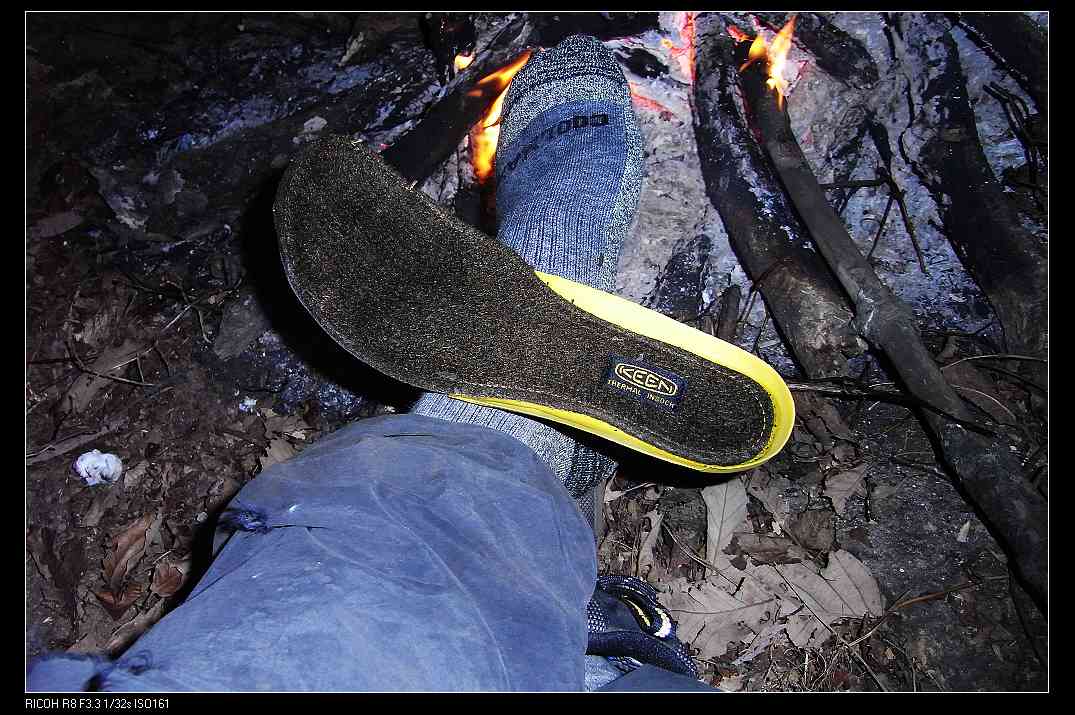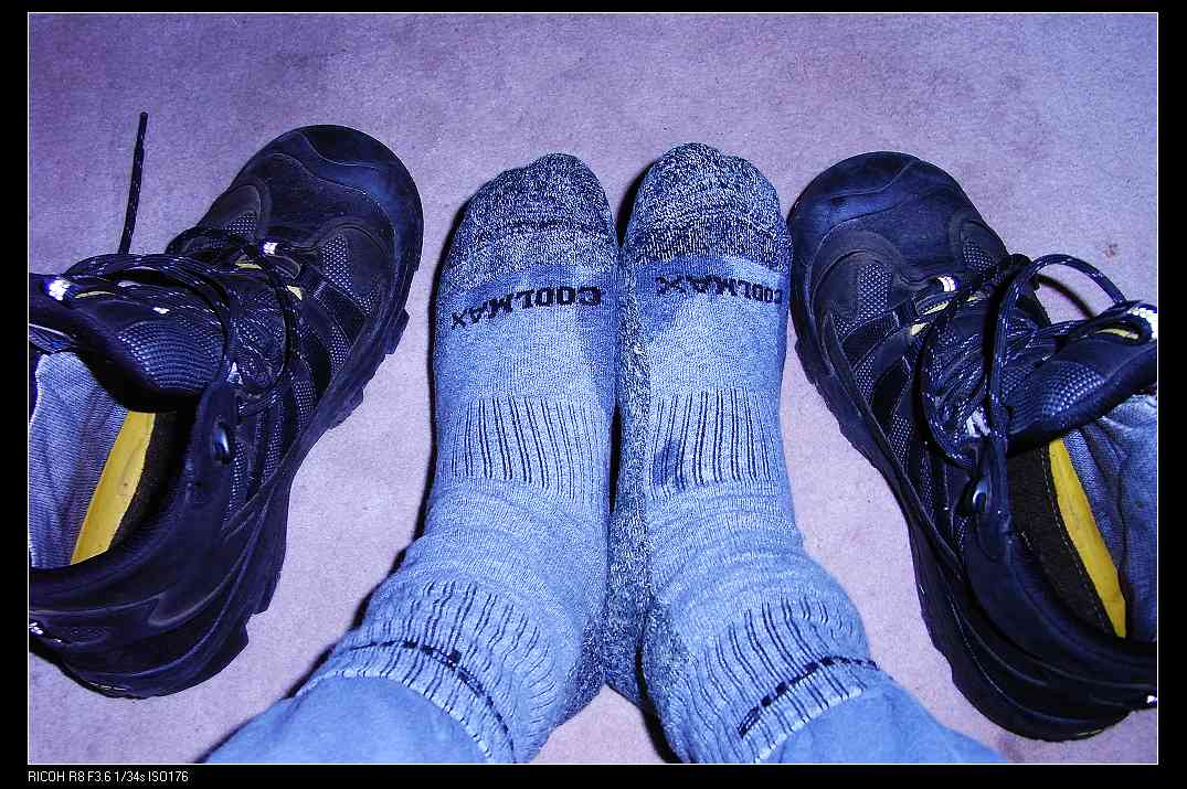 在老庙子营地,停止徒步后一个小时左右,被汗湿的袜子就变得冰凉,脚开始感觉到非常不舒服。本次行程,穿的是COOLMAX材料的厚袜子,按理袜子本身具有较好的排汗性,但汗气始终集聚在鞋子里面,无法排到鞋子的外面去,袜子的前脚掌基本全部被汗湿,鞋垫也湿漉漉的。幸亏当夜在营地有篝火,否则的话,鞋子放在帐篷外肯定会结冰。第二天的行程,结果与前一日完全相同,一天的路程下来,鞋子里面湿漉漉的。