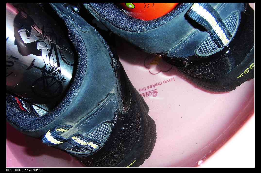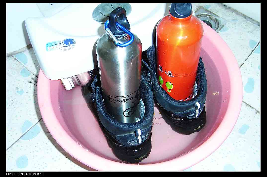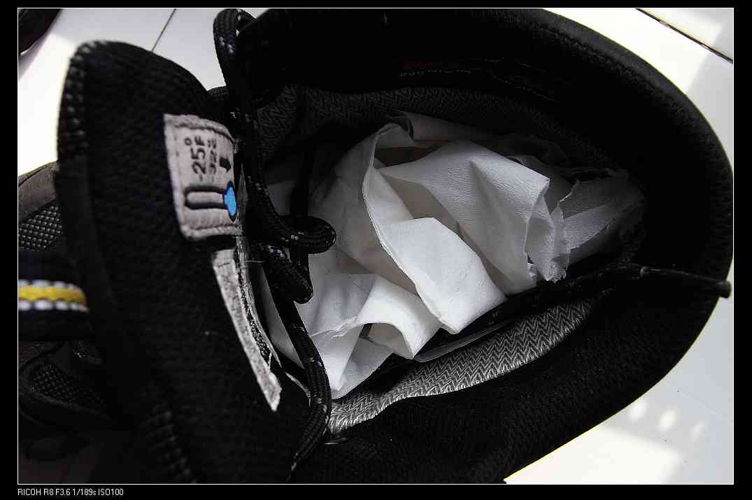 鉴于鞋子里面出现汗迹,从山里回来后,为了确认是透气性不好,还是鞋子防水性不好,特意在家做了浸水试验。把鞋子泡在水里面,鞋子里面塞上了2大团卫生纸,然后水面超过鞋面,再用重物压上。经过近4个小时的浸泡,鞋子没有出现透水现象,因为卫生纸从鞋子里面拿出来以后,没有一丝水迹,证明鞋子的防水性能没有问题。鞋子里出现汗迹的原因还是透气性能不够良好。