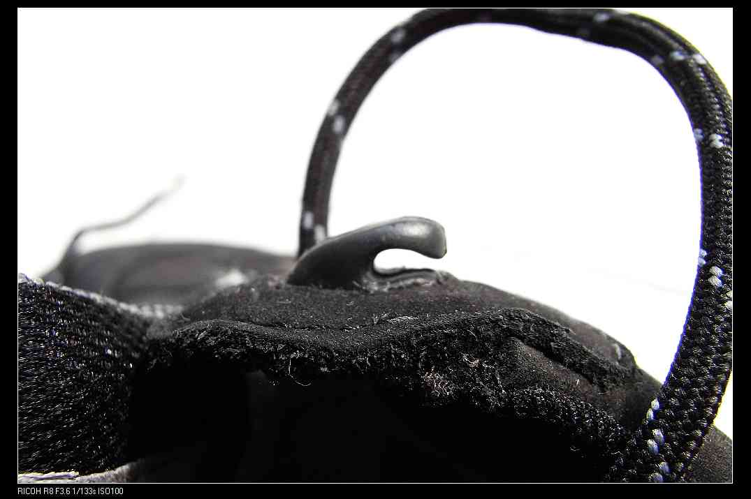 鞋子的最上面一对鞋带挂钩,设计了自锁功能,但实际锁定表现不是十分理想,应该也与鞋带材料有关。