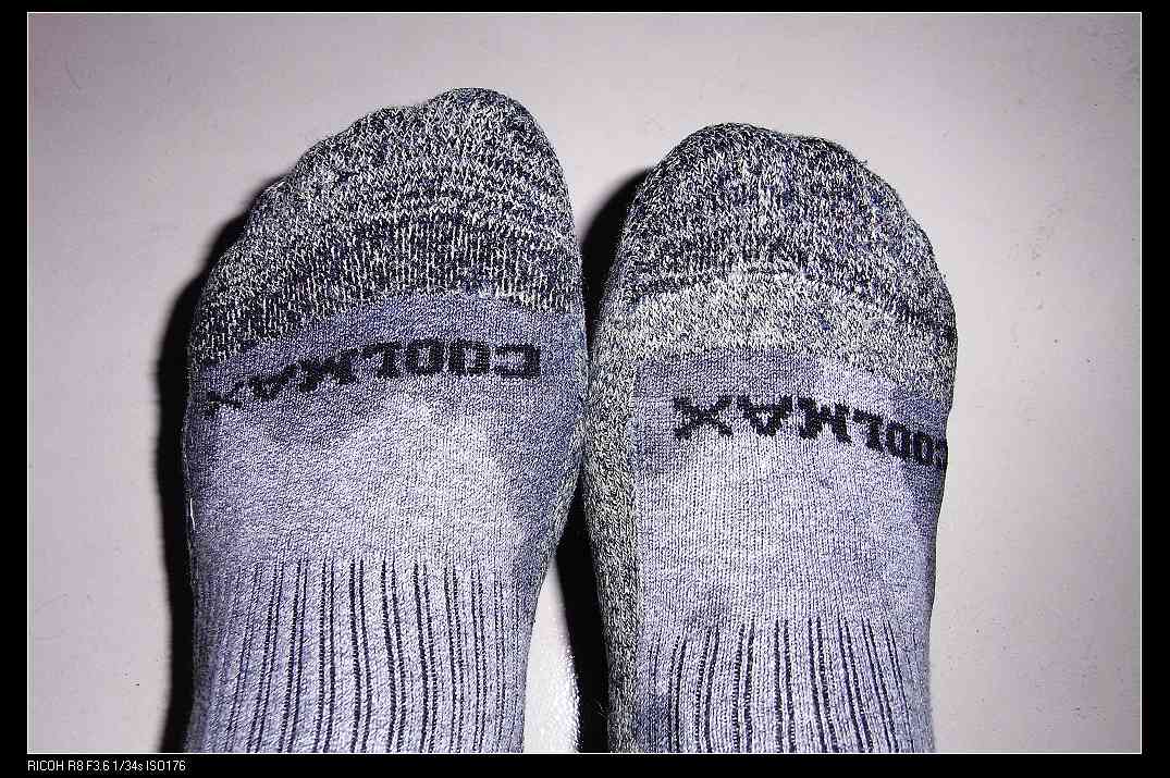 这款鞋最不好的表现是透气性。在行走了一天以后,鞋内的袜子竟然出现了大面积的汗迹,根据实际情况判断,应该属于鞋子的透气性能不够好。第一天测试时,穿了2双袜子,内袜为轻薄型COOLMAX材料制造,外袜为厚实的羊毛袜。第二天只穿了一双厚的COOLMAX袜子,也依然出现汗迹。