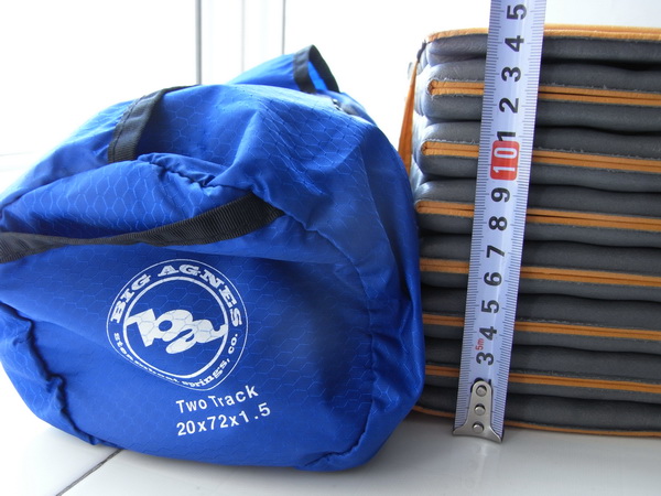该款垫子厂家标称的长、宽、厚度为20"x72"x1.5" (英制),换算成公制大约为508*1829*38mm。其中的厚度,在自然充气状态下为25mm,经过人工完全补充气以后,厚度为30mm左右(这个的厚度,还要看个人对垫子的充气程度,厂家标称是可达38mm,但估计是理论数值,基本上看来,能到30mm就不错了,如果要到38mm,估计需要使用打气筒之类的工具)。垫子放完气后的收敛尺寸大致为12cm×52cm(加上收纳袋的尺寸,且这个尺寸还要看垫子中气被排放的程度决定,如果垫子里的气体没有完全被释放,垫子的打包尺寸相应会大一些)