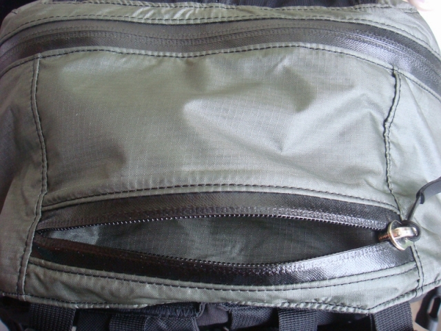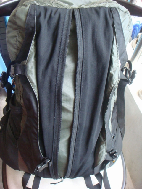 外部网状兜类似袋鼠袋的设计,不同的是由于使用弹性网布,容量可大可小,细密的网眼利于排出湿气。看过国外的测评认为这里不防水是个遗憾,我的观点相反,其实官方网站也说明适合存放常用、易取和打湿的物品,我使用时放的是护膝、毛巾和已汗湿的T恤,可见这种弹性网布的选择恰是体现了背包设计的意图。而一拉到底贯通式前面板拉链也正是为了配合实现这一意图,便于存取。