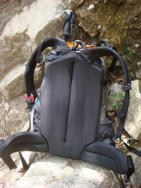 这2天的气温最高超过30度,这样热的天气下使用晴朗,曾担心厚厚的背负系统不利于通风排汗会很热,在炎炎夏日里不舒服,实际使用中出乎意料倒没感觉到湿热,想了一下,原因可能在于:1,运动中背包与背部间或产生的间隙可以起到一定的通风效果;2,背板、肩带、腰带的填充物是不吸水的EVA发泡材料;3,穿着的coolmax面料T恤排汗效果好。