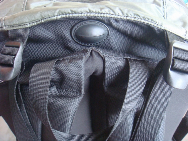 晴朗的背板(约2.1cm)、腰带(约2cm)、肩带(约1cm)都很厚,用手挤压揉捏可以感觉出肩带的填充材料有很强的韧性,推断以此保证肩带的强度和舒适性;腰带的厚度增加韧性次之,估计是强调舒适性和更好的支撑效果;而背板则是如海绵般柔软无韧性可言,猜想设计者的意图只强调背负时的舒适性。从手感上判断这3个部位虽然都是采用EVA发泡材料做填充物,但材料类别上应有不同,在不割开细查的情况下暂时还不清楚其特性有何区别,只能猜测如上。