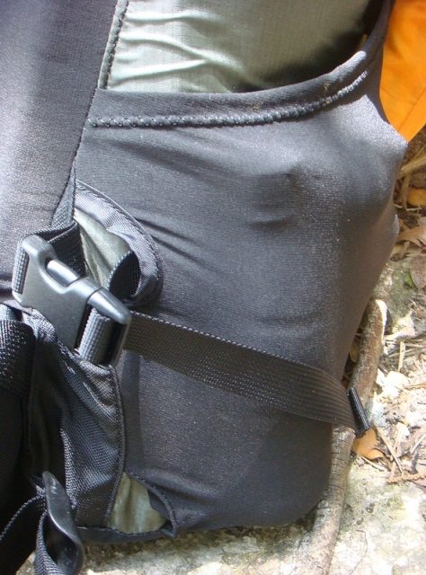 主袋两侧是花岗岩一贯使用的大尺寸高弹力侧兜:所谓大尺寸,就是它比常见的其他品牌背包的侧兜要高一些;所谓高弹力,一来拉伸后可以装载更多物品,二来贴身裹紧物品不易脱落。兜口设计成斜线方便反手取放,有趣的设计还有2处:一是侧兜底部内角留出三角形开口,便于清理倒出枝叶草片等杂物;二是侧兜两侧开了半圆形的口子,束紧带除了从侧兜外部收紧,也可以穿进侧兜内分隔或加固物品。