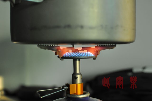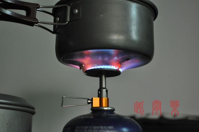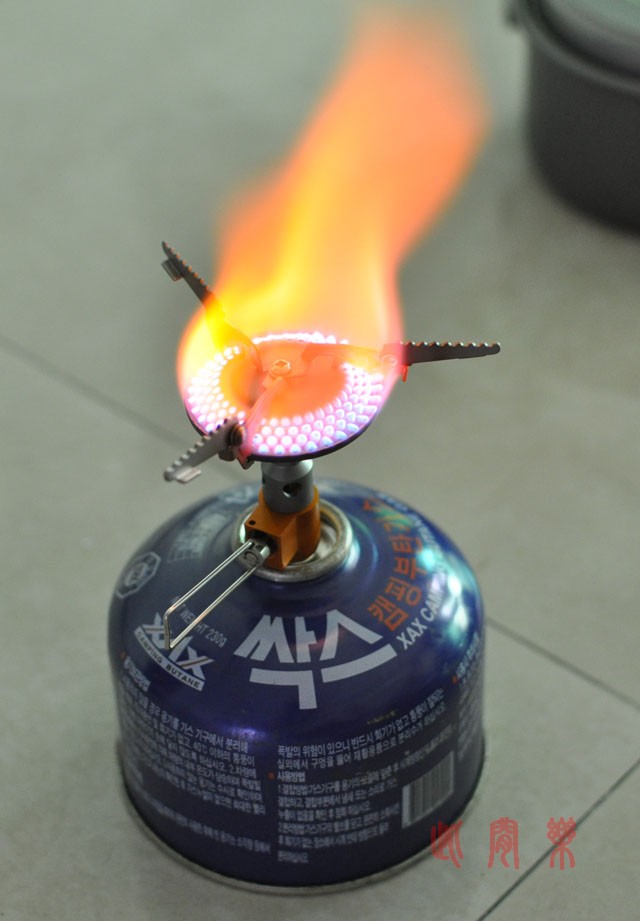 10)点火的样子。开始燃烧的时候,火焰还是蓝色的,在炉头烧红以后,火焰也跟着变黄色的了。调节阀非常好用,火力调节顺滑,没有忽大忽小的问题。