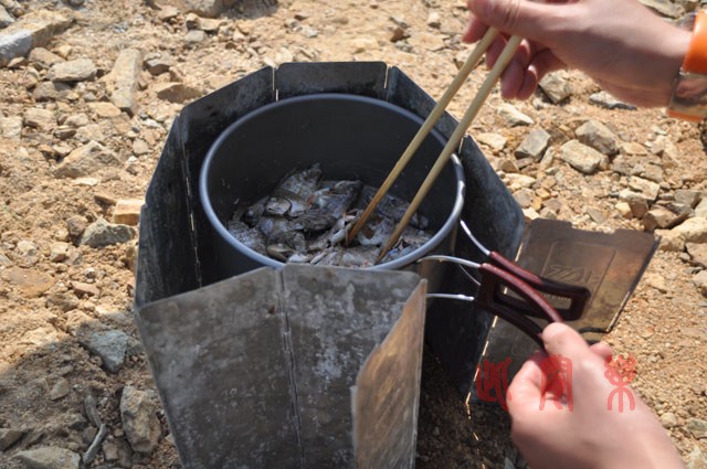 16)白盆珠湖边现钓鱼现做鱼粥,先炒炒去腥,然后换更大的锅煮稀饭。大炉盘下,整个锅底都有火,真方便
