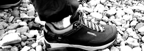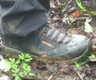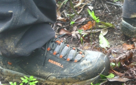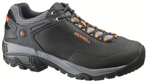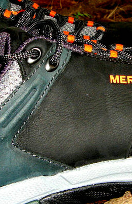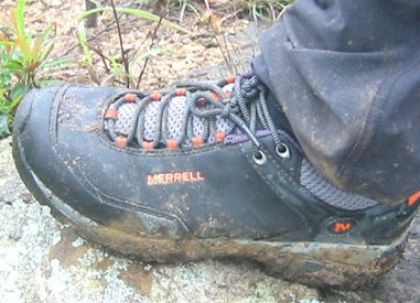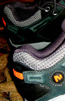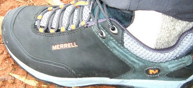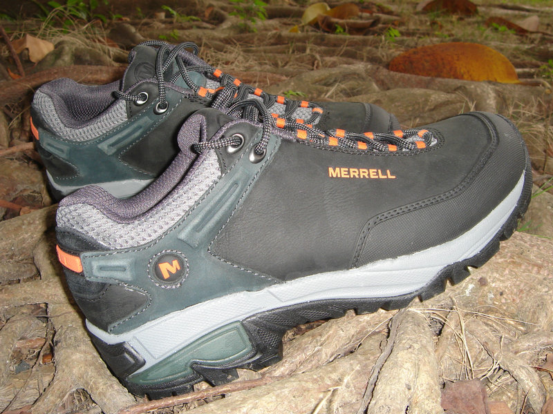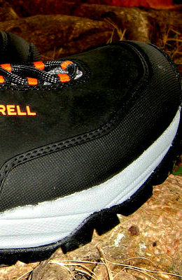 3月31日晚收到鞋子,赶紧打开包装(手提袋挺漂亮的,可惜贴满了胶纸不能再用了),稳重、浑厚的外形,黑色的皮子与醒目的橙色“MERRELL”搭配显得很和谐。宽圆的鞋头、偏宽的鞋型很适合中国人的宽脚板。厚实的V底、舒适的鞋垫,穿上去以后即使走一天的路也不觉得以往那样脚底发紧张疼。鞋前端的防护橡胶跟鞋子搭配既实用又美观,确是一双名副其实的专业户外登山鞋。