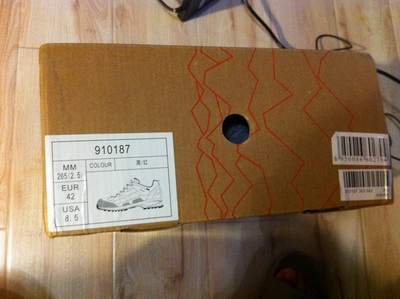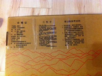 打开包装,其鞋盒的侧面贴有关于款号、尺码、颜色等信息的标签,以及合格证、三包卡和登山鞋保养说明