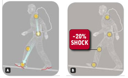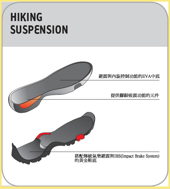 A.La Sportiva与Vibram公司共同研发IMPACT BRAKE SYSTEM——IBS鞋底减震系统,IBS鞋底系统的设计目的用来减少行走时的冲击力,在行走于较坚硬的地形时能够有效降低20%的冲击力,进而减少身体的负担;