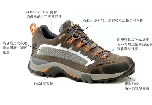 La sportiva的徒步鞋采用意大利传统工艺与现代科技相结合,制造了最佳的行走伴侣,使身体(不只是脚)在行走中得到最完善的保护和最舒适的帮助。其产品全部采取最顶级的意大利皮料,结合最严谨的制鞋工艺,制作出最佳的产品。独特的 RFS 3D (Reactive Flex System) 技術,外部搭配 TPU 支撑系統。