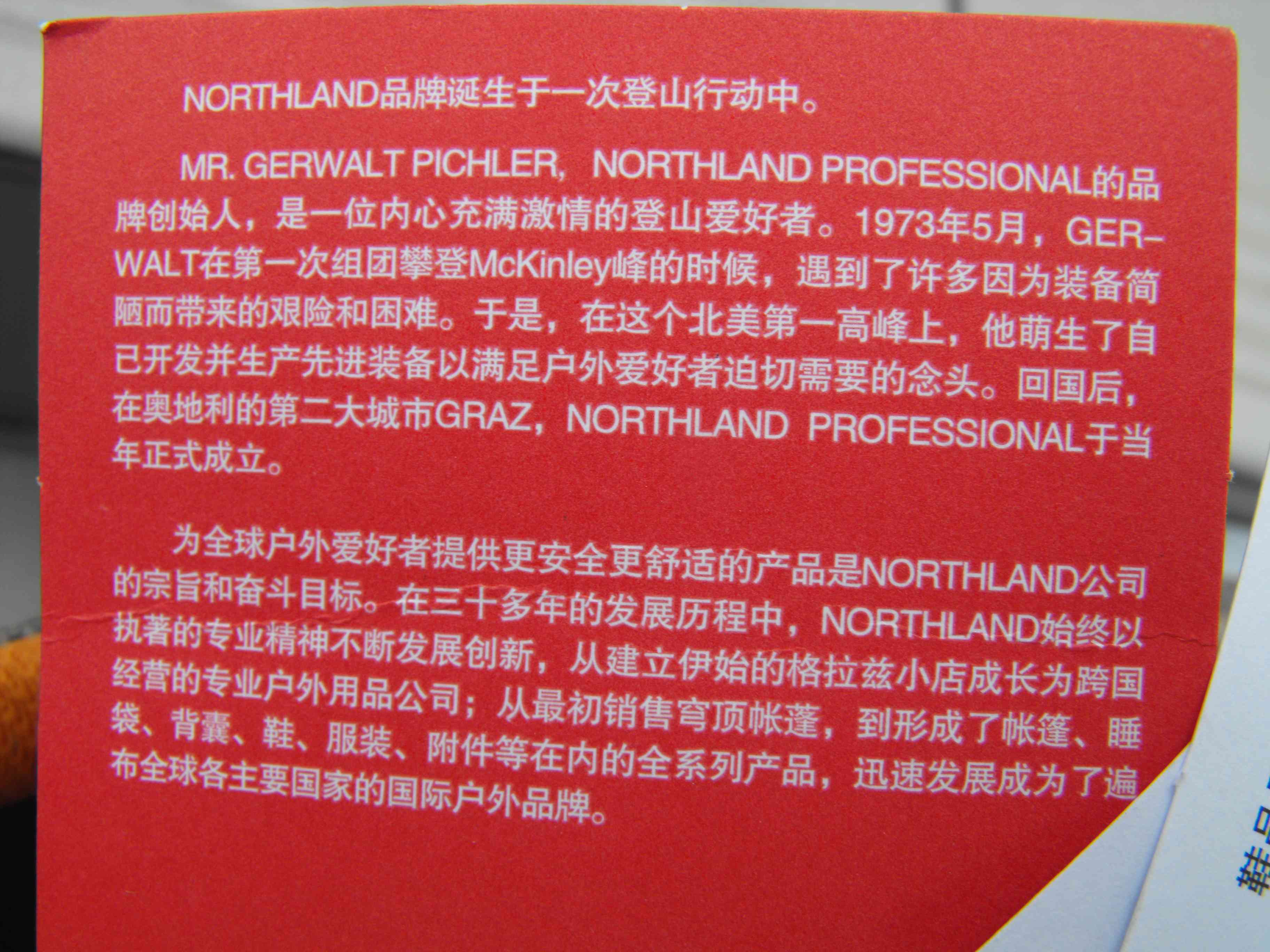 NORTHLAND品牌于1973年在奥地利施泰尔省诞生,其品牌创始人Mr. Gerwalt将为户外爱好者提供功能更专业、穿着更舒适的户外产品作为公司奋斗目标。NORTHLAND在三十多年的发展历程中以专业精神为全球户外运动爱好者提供功能强大、安全舒适的专业户外产品,并且不断汲取各种建议,坚持科技创新,现已发展成为遍布全球各主要国家的国际性户外品牌。