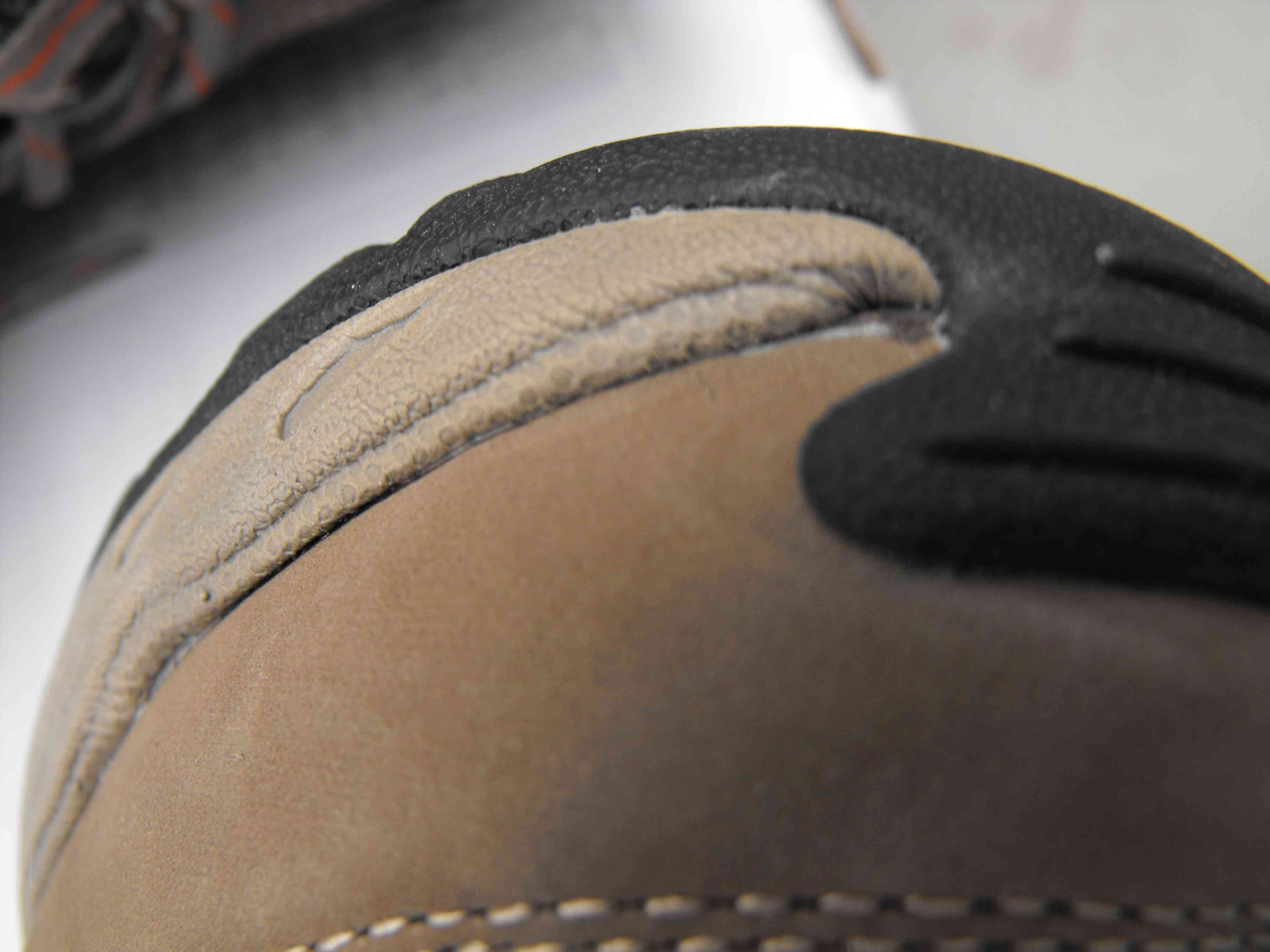 防撞鞋舌:硬度适中,中间有防滑纹路,鞋头的胶合看起来不是很好,穿了几天后果然开胶了。