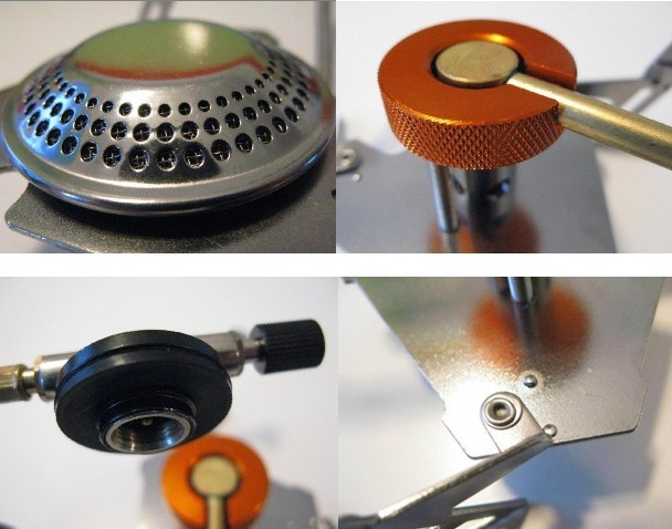 仔细观察,觉得此款气炉的各部分做工比较精细,高强度铝合金与不锈钢材质摸上去手感光滑舒适,整体结构设计非常紧凑、合理、规整,火盘的直径很大,可以增加锅底的加热面积,充分体现了该款气炉的节能特色。火盘以下的部分设计的非常小巧,支架采用镂空设计,火盘座部分的设计给人感觉很有创意,是三边长三边短的六边形,突出的三个短边分别承担三个支架,这样的设计也突出了节省材料减少自重的特点,使得整个气炉的重量充分体现了目前户外装备的发展趋势——轻量化,而高强度铝合金与不锈钢材质,多向折叠式加厚支架设计使得这款气炉保持了应有的坚固。所有折叠部分的链接都是采用铆接,承重能力和耐用性大大提高,满足长期可靠的使用要求。支架与套锅底接触面有锯齿,增加摩擦系数。个人感觉商家在这款气炉的设计上注重了每一处细节,很有大品牌的风范。