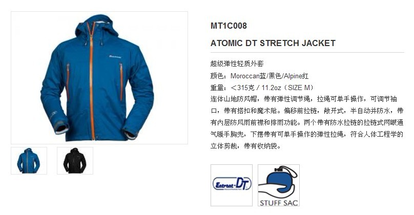 体验物品名称型号:Montane ATOMIC DT STRETCH JACKET冲锋衣