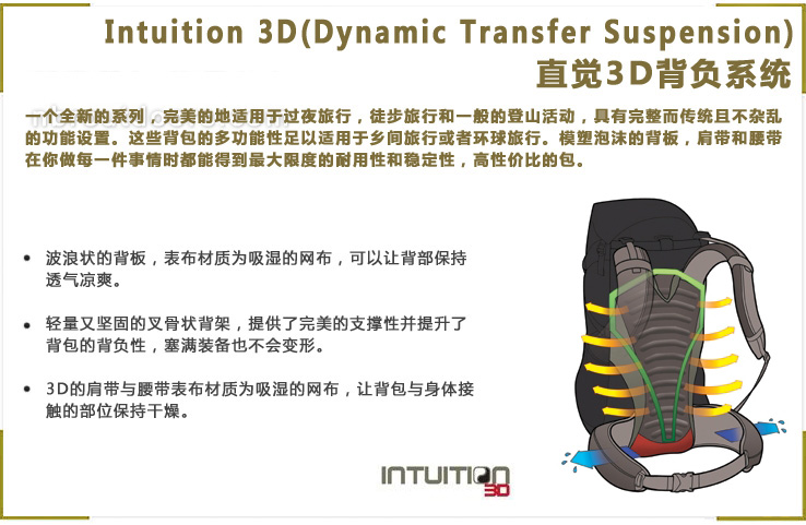 直觉3D背负系统,一个全新的系列,3D的肩带与腰带,可快速调整,提升了更