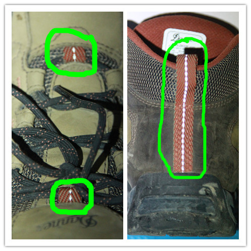 鞋面的鞋带环上和鞋跟上的吊带内,分别有长短不一的反光条,在黑暗中行走有利于后面的辨识。