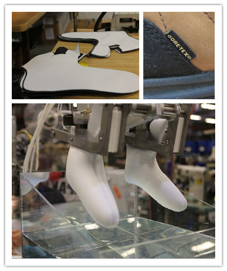 防水透气的GORE-TEX内衬。美国俄勒冈州Danner波特兰工厂GORE-TEX生产线视频 ,有关GORE-TEX网上的资料汗牛充栋,这里就不再介绍了。下图来自Danner在美国俄勒冈州波特兰市工厂生产车间实地。