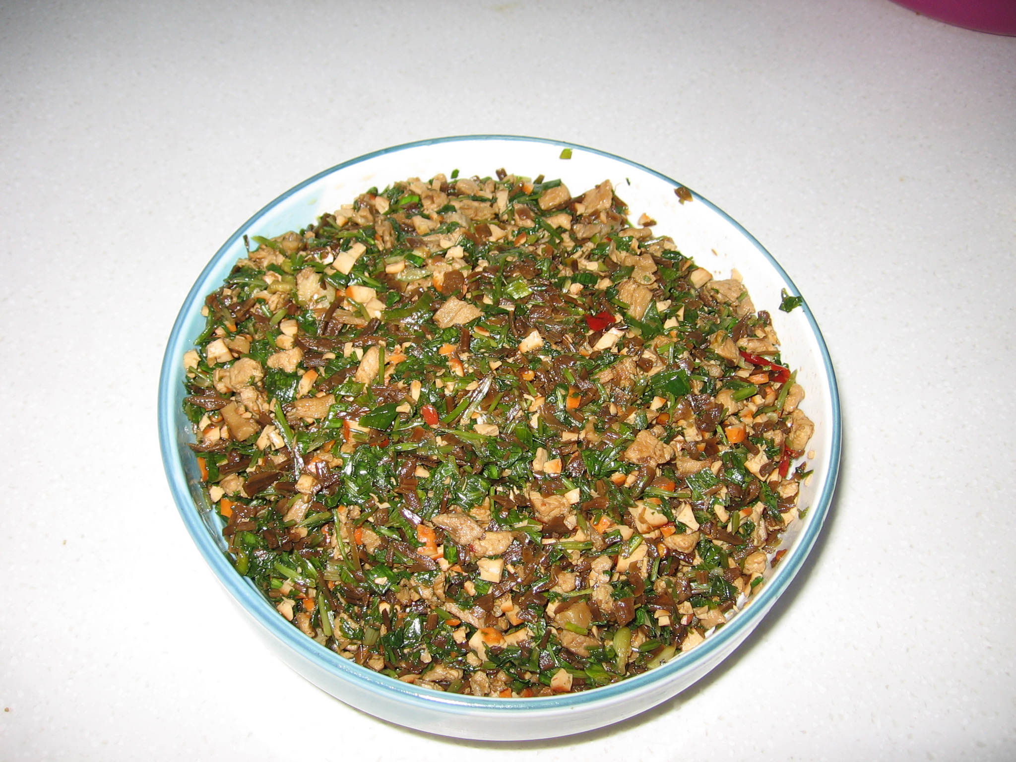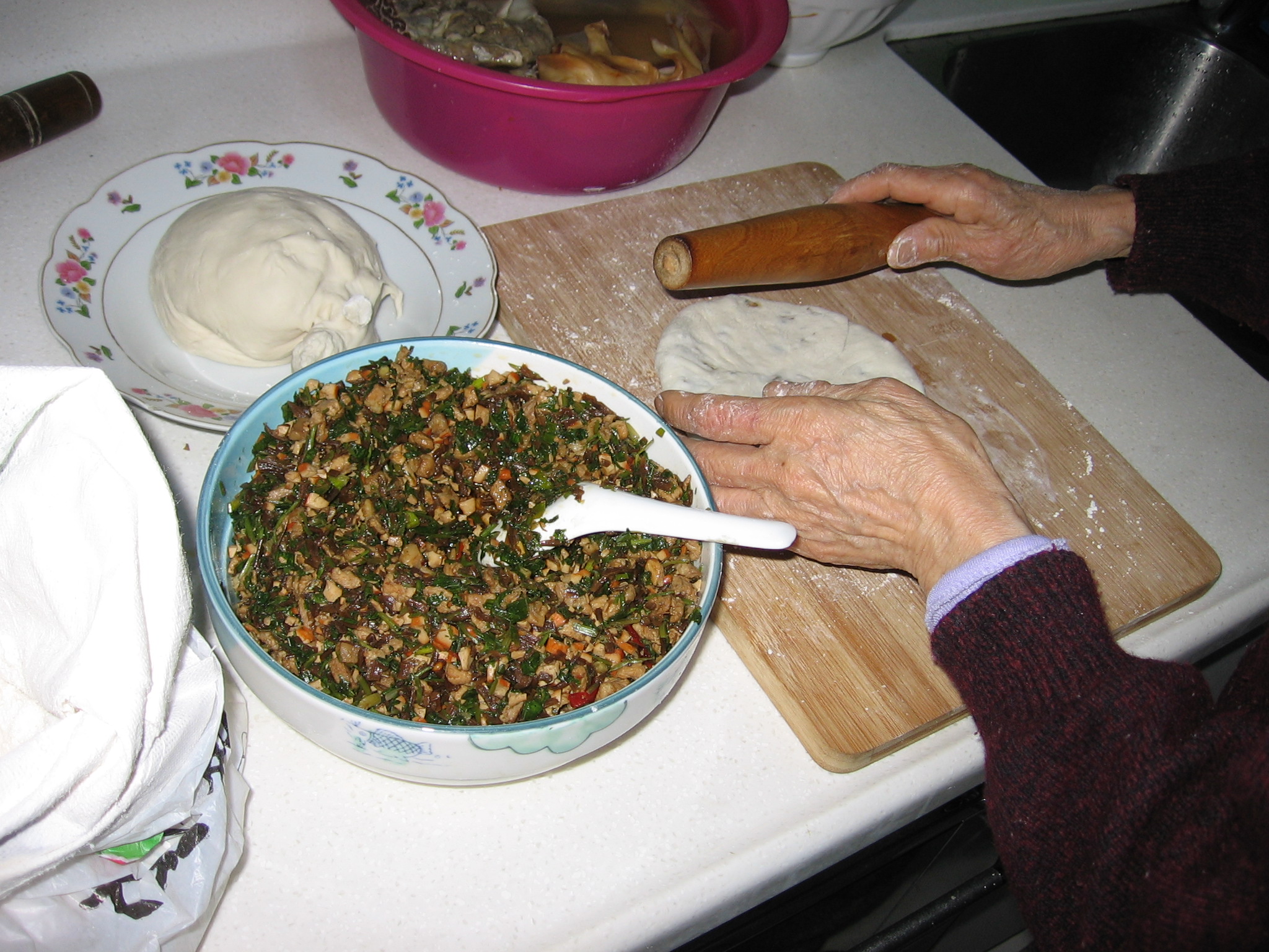 “粑粑”的馅有好多种,大概有咸菜肉丁、纯咸菜、萝卜肉丁、纯萝卜、大蒜豆干肉丁、豆角肉丁等等。馅在做饼之前,是一定要先用油炒一炒,据说是起香味的。 在以前的时代,我喜欢吃有肉馅的,可惜受条件所限,肉丁几乎是装饰,也就有些肥肉星星点点散落在馅中,现在条件好了,人们都喜欢吃素馅的了,可我还是喜欢 吃肉馅的,只是不再是纯肥肉,而是肥瘦兼半了。我母亲不管走到那里,都时常会做一些“粑粑”,不时给邻里好友分享,赢得了不少赞誉。