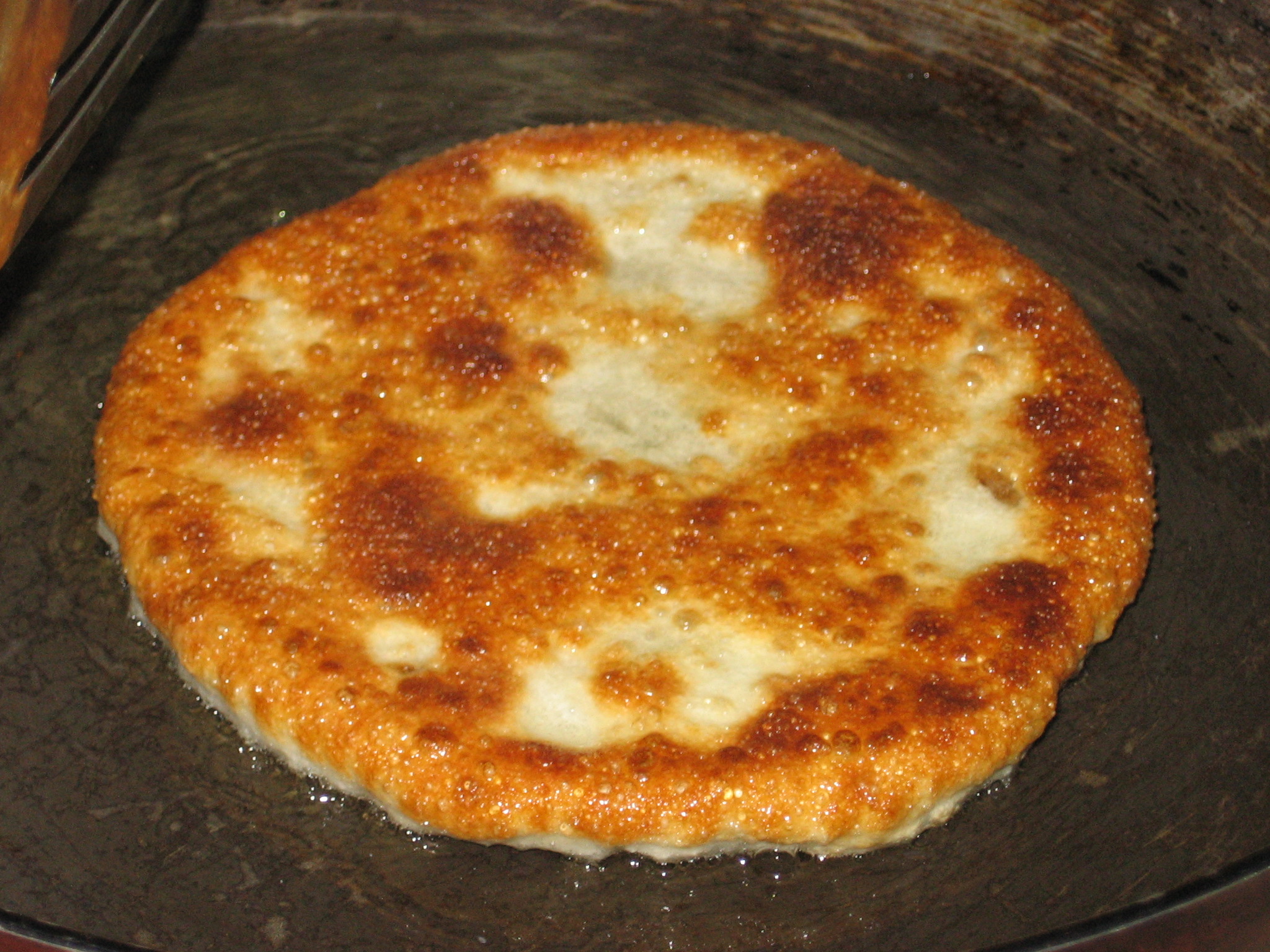 在家乡,“粑粑”是一种很大众的食品,是不登大雅之堂的,大约属于贩夫走卒、引车贩浆之流劳作后的美食,价格低廉之极。路边巷尾,只要支个炉子,架上个平 底铁锅,摆一块案板,就可以把档口撑起来了。一团和过的面,几盆内容不一的馅,一把平头锅铲,一根擀面杖,一碗加过清水的油,就这样,可以开始操作了。把 面切成小团,再用擀面杖把面团擀成面皮,包上馅,再用手把面捏成饼状,在平底锅里滩开,浇上油水,用小火慢慢地煎烤,不时添加些油水,时而翻边,一直到两 面金黄,香喷喷的“粑粑”就出锅了。