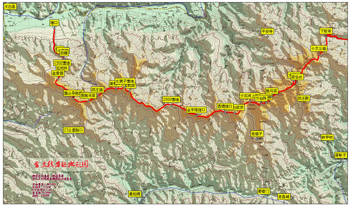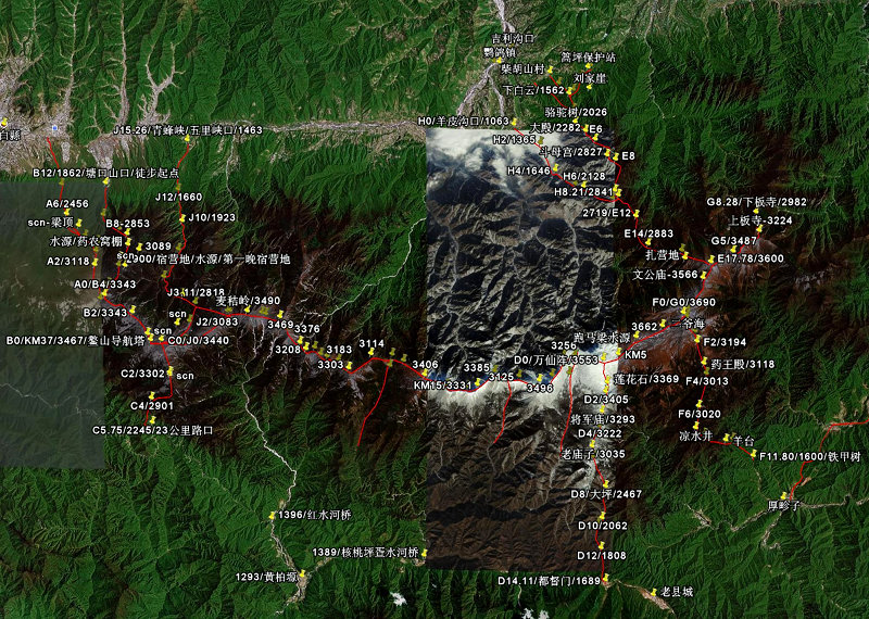 以上是本次鳌太穿越全程GPS轨迹图,实际完成线路为:塘口---药棚---2900营地---螯山大梁---导航架---药王洞---麦秸岭---水窝子营地---飞机梁---2800营地---金字塔---西塬---太白梁---东塬---万仙阵---雷公庙---东跑马梁---大爷海---拔仙台---文公庙---下板寺,后自汤峪出山。