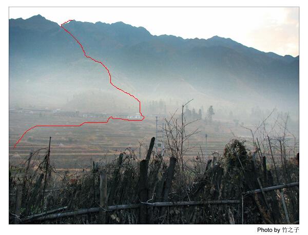 7:25 海拔690米。出发,东偏南30度方向,穿过一片农田, 在山脚一排五六栋房子的东南侧后方,有两条山路,岔路直行,由山脊南侧山谷上到山脊。(岔路如选左,即绕房子后面的路,应该是直上山脊的路。)