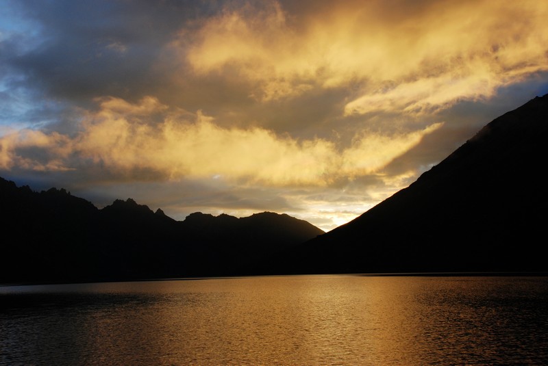 一早彩霞漫天,风光无限。9点40出发,沿日干错徒步,还是灌木,泥沼,路径明显,1小时后就到了湖边尽头,有一户牧民,桃源人家啊!向他问了一下路,垭口在山的左边。然后继续穿过一片草地来到上日干错,两湖之间有河,过河费了一些周折,1点左右在上日干错尽头路餐。
