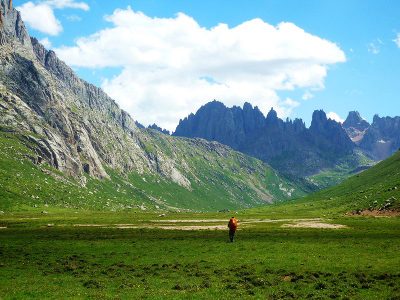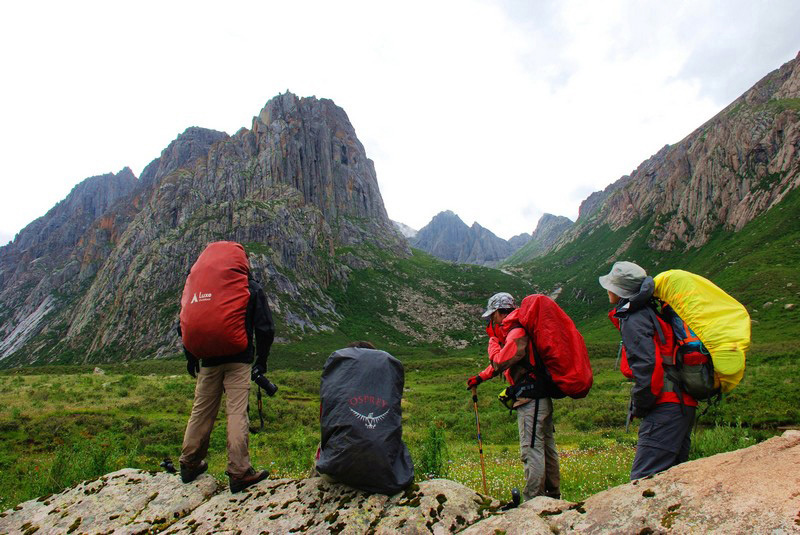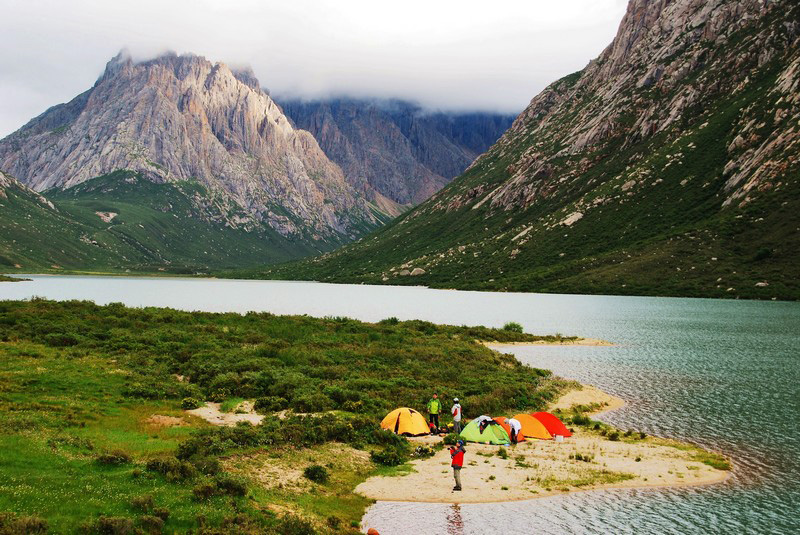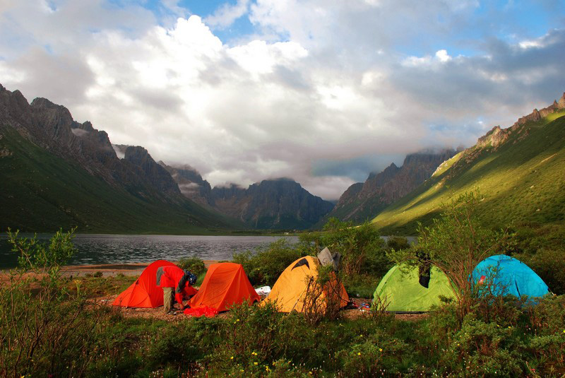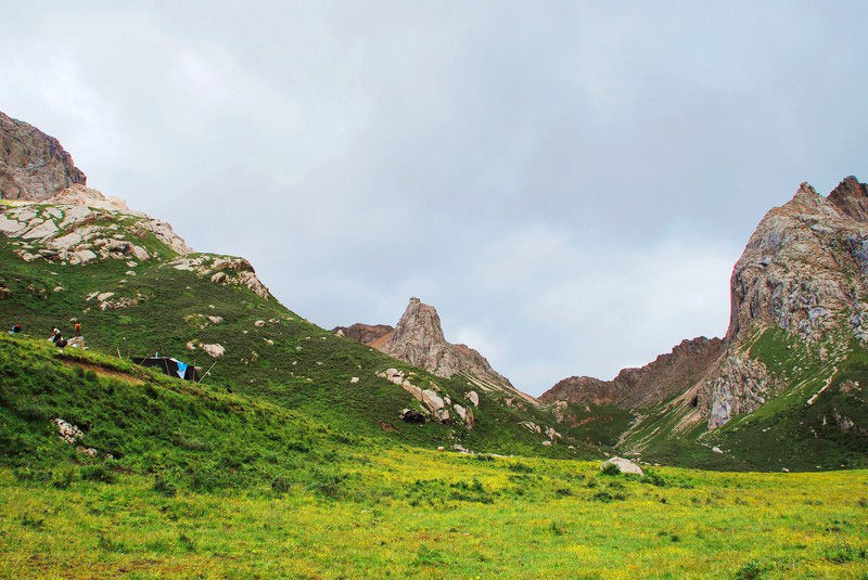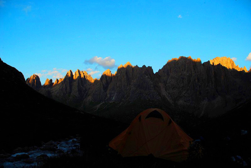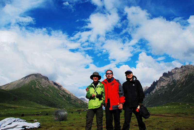 2点继续沿山路行进,右转进入山谷后,山谷3面环山,眼前出现3个垭口,我和东南对要翻那个垭口,有左右两边不同的选择,争执无果。都说要充分相信你的队友,我固执地选择了相信自己,人性的弱点啊!路线不明,而且已是下午3点,爬上垭口估计天色就晚了,还要下山扎营……于是在靠近最底的垭口下河边草地扎营,原计划是今晚到阿尔加错的,后来的事实证明,还是多扎营一天靠谱。