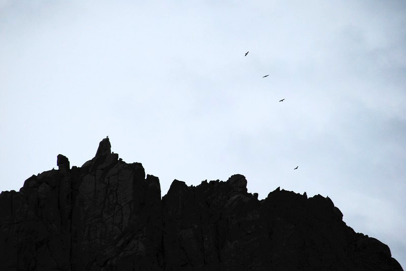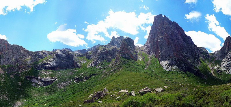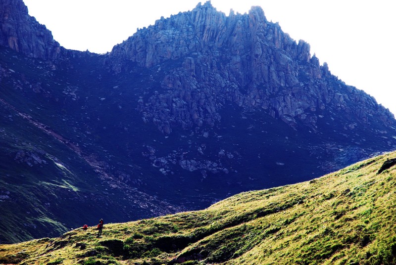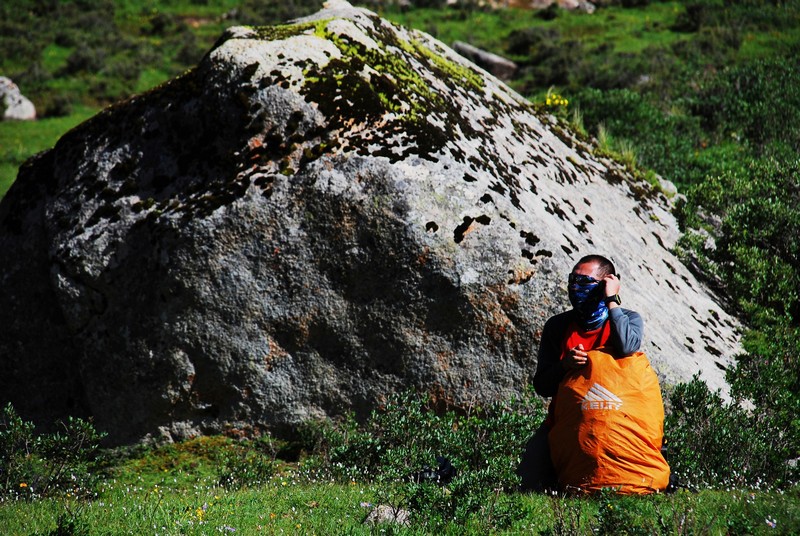 10点出发,早上拔营时,忽然发现垭口上有个骑马的人在观望,原来真正的垭口在左边,汗啊!但左边的垭口很宽阔,中间有块巨石,又将其分成左右两个垭口,看不见路的痕迹,最后我们在长焦镜头里发现右边垭口上有貌似经幡的东西挂下来,于是决定走右边。