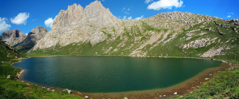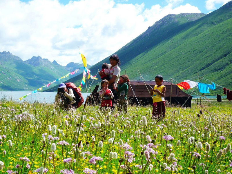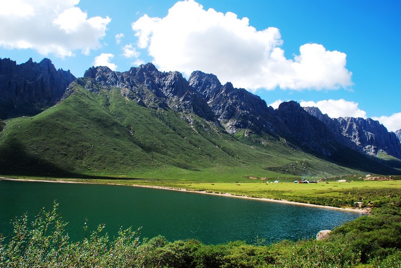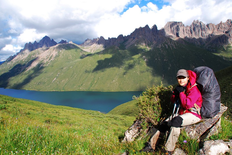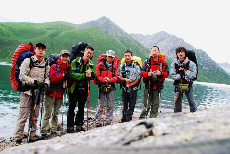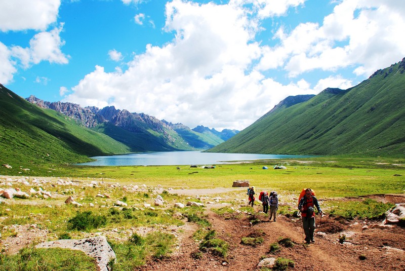 1点半上到垭口,路餐,2点出发,眼前是一片宽谷,牦牛群随处可见,得莫措就在远处,5点左右到达得莫措,过了得莫措,不断见到牧民的帐篷,问路很方便。,7点到达阿尔加措,在湖边草地扎营。