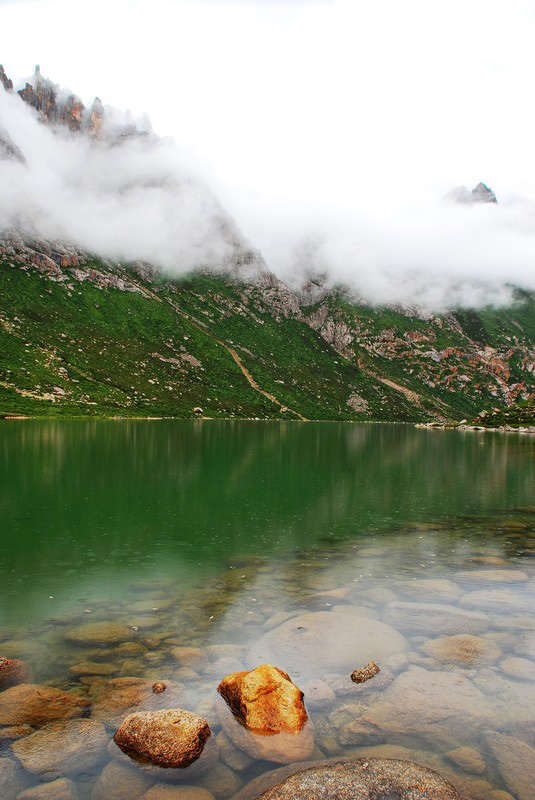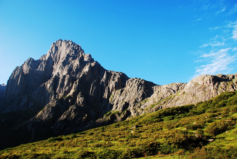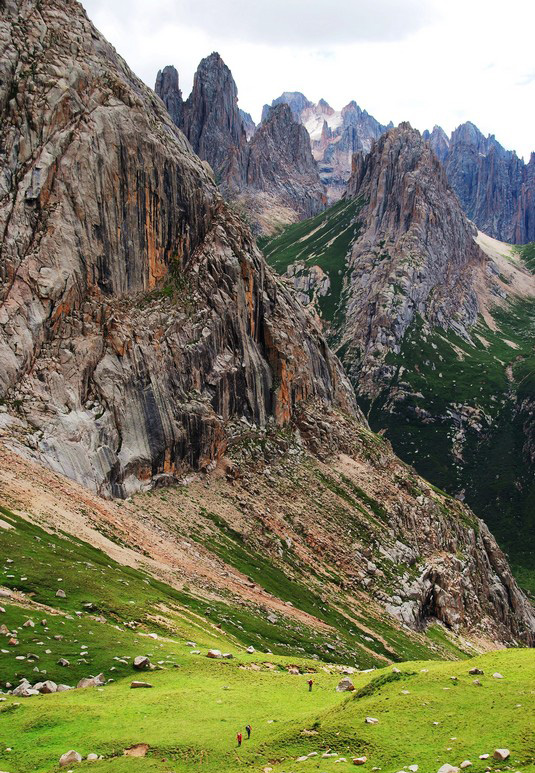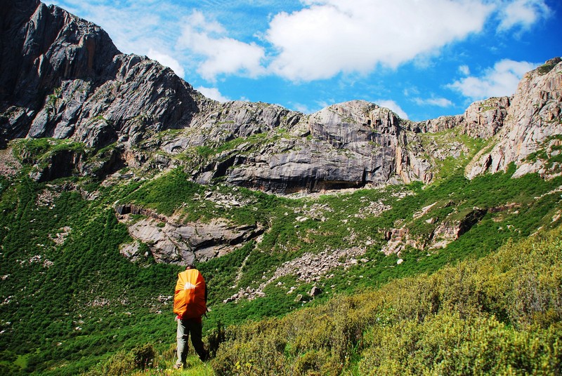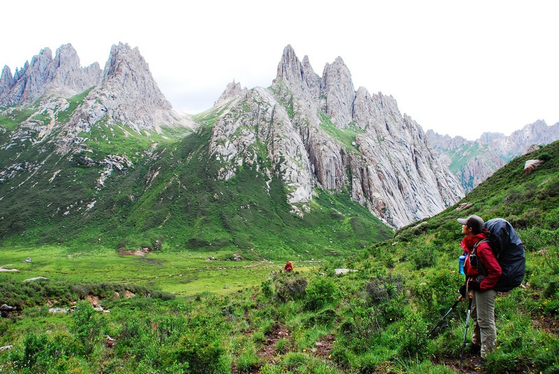一路下切之后,身陷山谷中的杜鹃密林,进退两难,背着大包很难穿行,然后是攀爬水流冲刷出的乱石,最后是一段很陡的草坡,除了登山杖,没有什么可以依靠......其中的艰辛和危险可以看牛牛同学的游记。