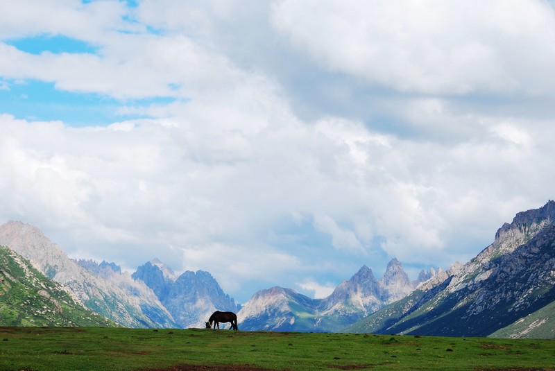 等到雨停,近12点才出发,走出阿尔加错,一路向西,终于有大路走啦。中午时分,走在广阔的宽谷里,阴霭天空下,远处的帐篷传来诵经的声音,真是空谷梵音啊,仿佛是对我们此行迟来的祝福。